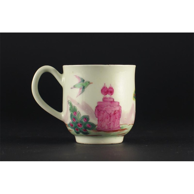 A Worcester coffee cup, brightly painted with the 'Valentine' pattern. Two minute chips to the rim. c.1760.
