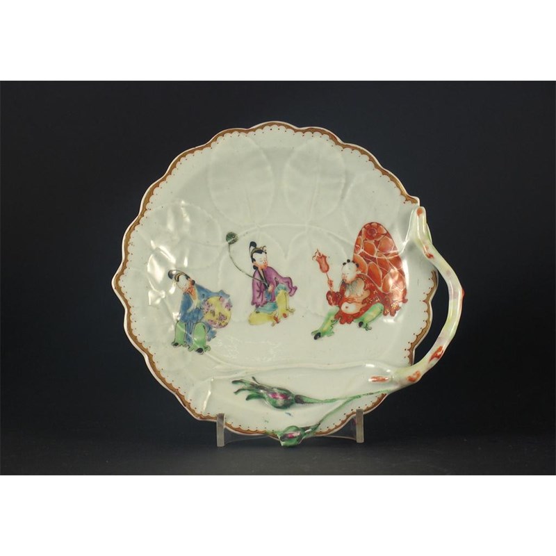 A Worcester blind earl sweetmeat dish, painted in coloured enamels with the 'Pu Tai' pattern, unmarked. A little wear and good restoration to the handle. c.1760, 16.5cm.