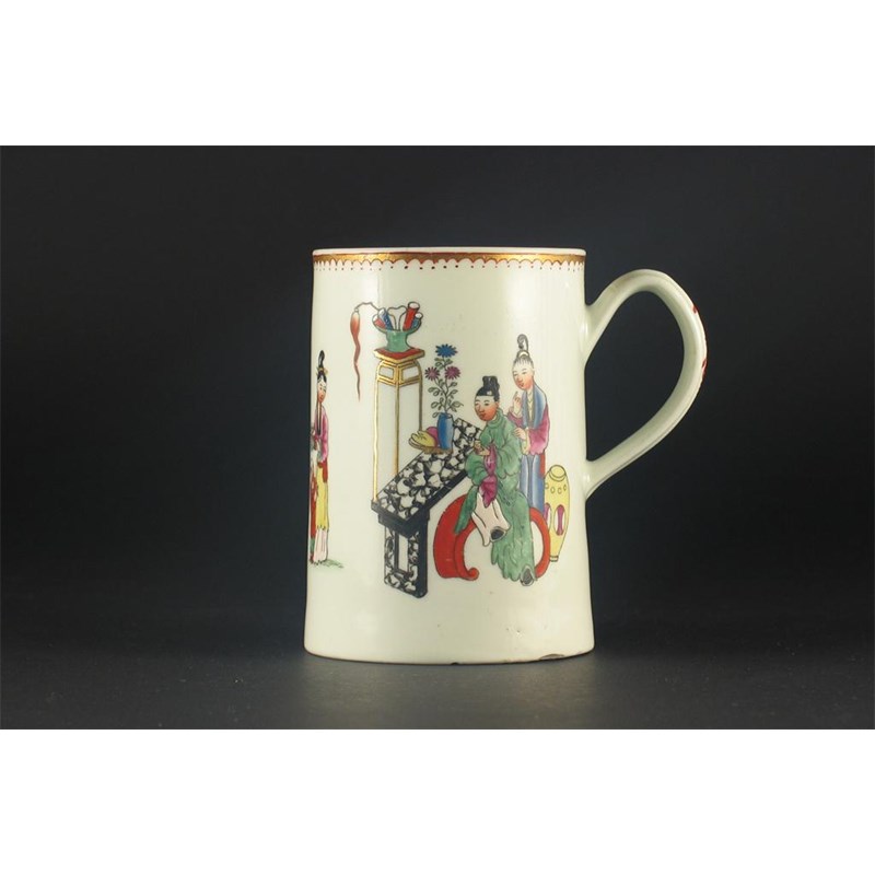A Worcester cylindrical mug, decorated with Chinese figures and tables, unmarked, c.1770, 12cm.