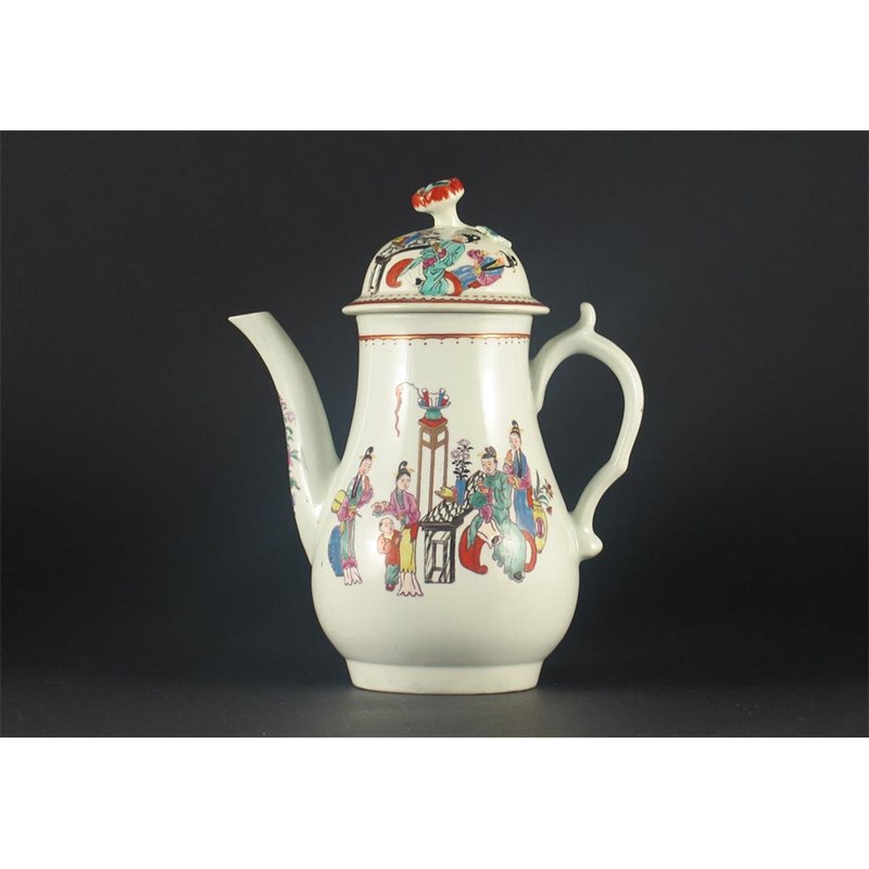 A Worcester coffee pot and cover, decorated with a chinoiserie design of figures, unmarked, c.1770, 18.5cm. (2)