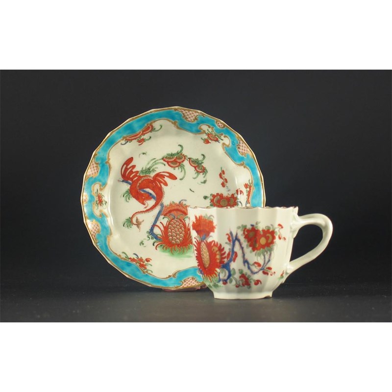 A Worcester fluted coffee cup and saucer, decorated with the 'Jabberwocky' pattern, the saucer with a square seal mark. The cup with a small footrim chip. c.1770. (2)