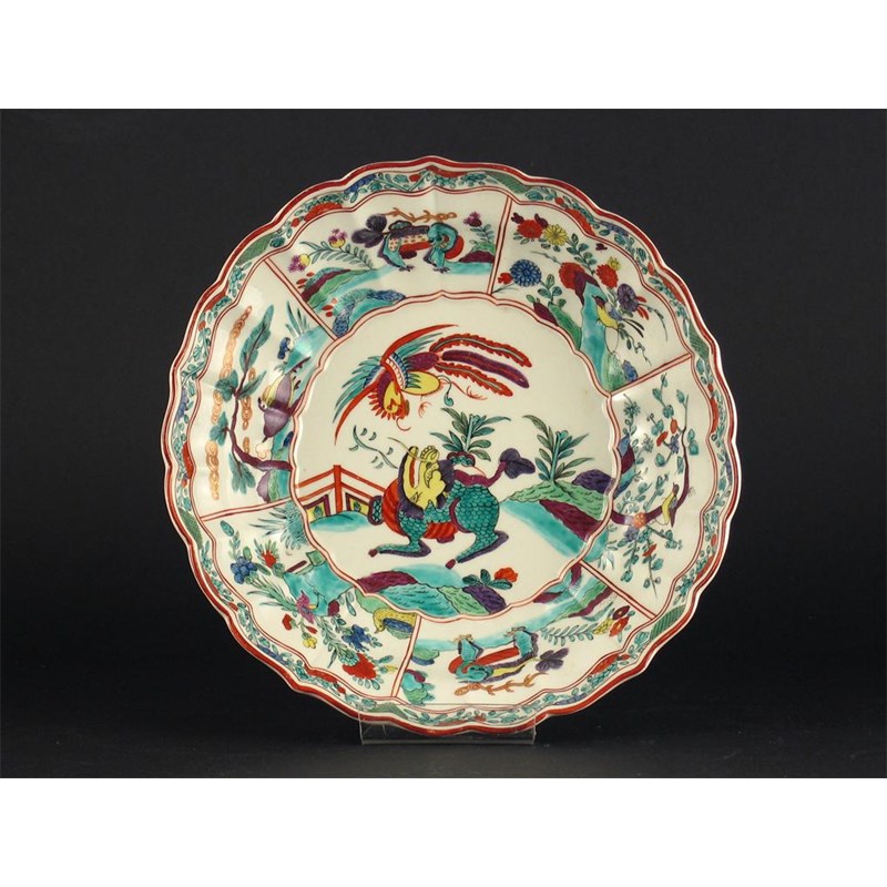 A Worcester shallow bowl, brightly painted with a phoenix and a lion dog within border panels of birds and further mythical beasts, a puce Flight mark, late 18th century, 23cm.