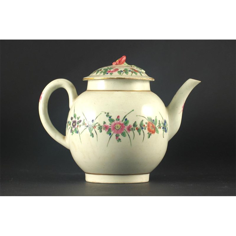 A teapot and cover, probably Caughley, painted with bands of coloured flowers and leaves, unmarked. The knop restored. c.1770, 17cm. (2)