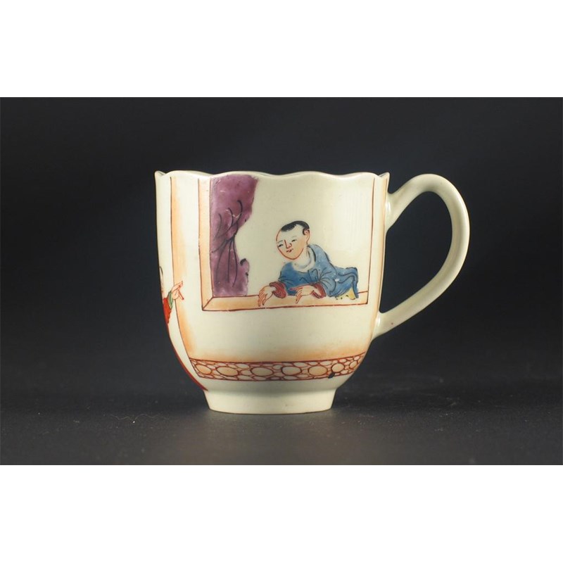 A Worcester cup, with an underglaze blue inner border, the exterior with Chinese figures, unmarked, c.1770, 6cm.