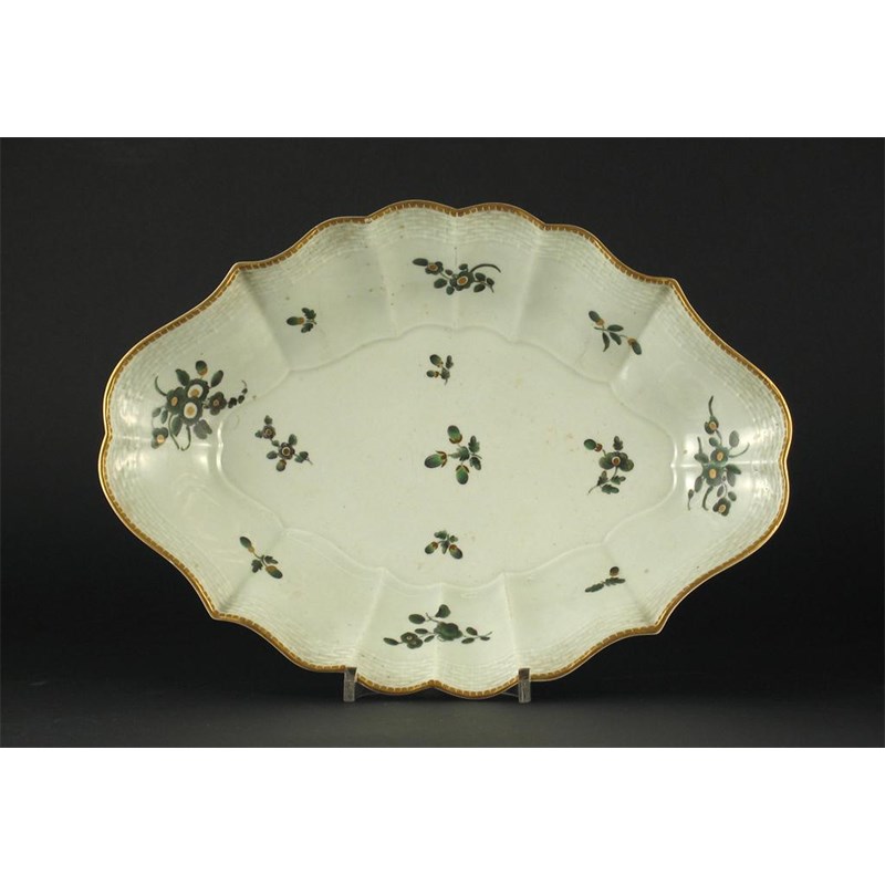 A Worcester dish, with a basket moulded border, painted with green and gilt flower sprigs, no marks, c.1770, 31cm.