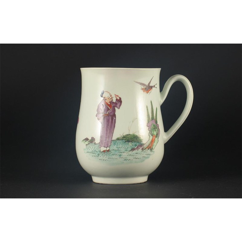 A Worcester bell-shaped mug, polychrome painted with the 'Beckoning Chinaman' pattern, unmarked. Some good restoration. c.1758, 11.6cm. Cf. Spero & Sandon, The Zorensky Collection, no.137 for a cylindrical mug in this pattern.