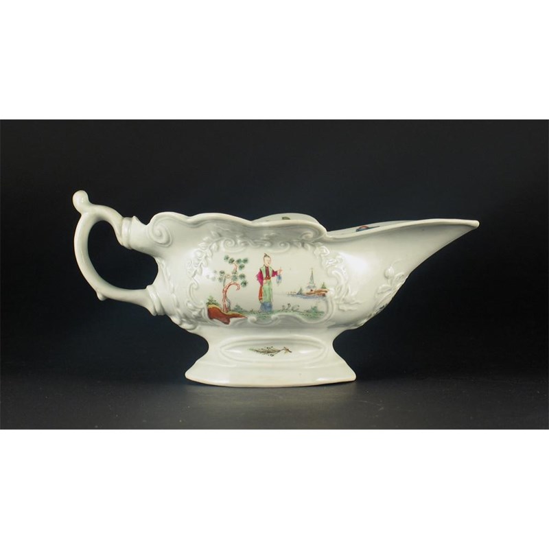An early Worcester silver-shape sauceboat, painted with a Chinese figure to each side, one holding a fan, the other a flower, unmarked. Minor faults. c.1754, 19cm.