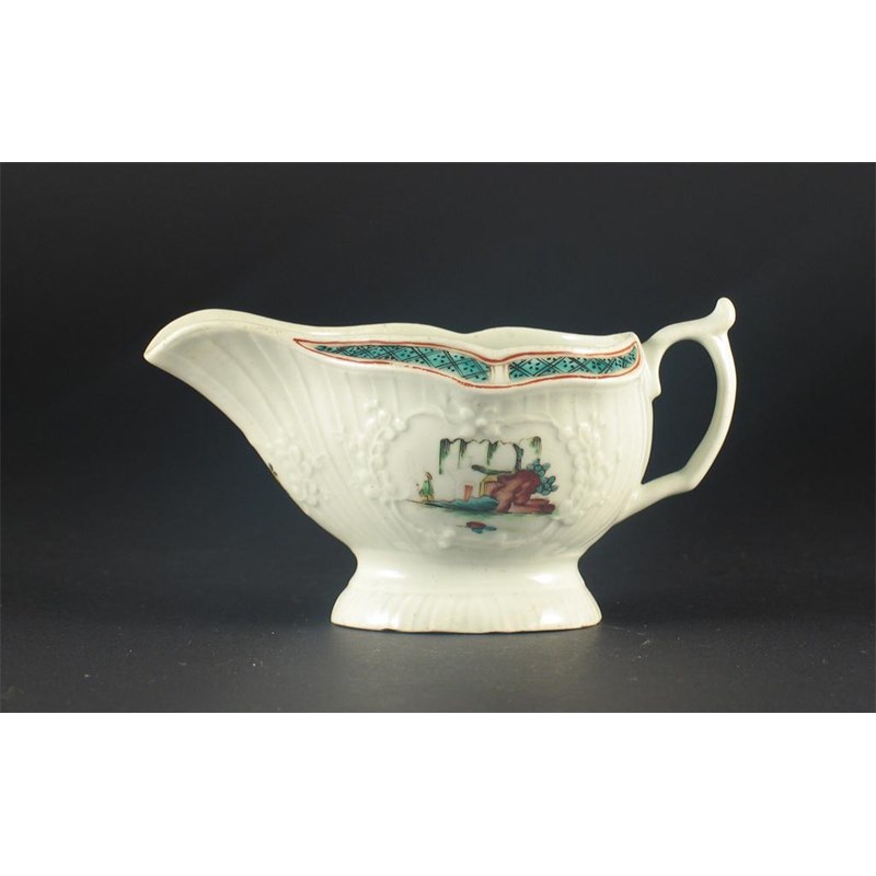 A Worcester strap fluted sauceboat, painted in the famille verte palette with chinoiserie landscapes, unmarked, c.1755, 13.5cm. Cf. Spero & Sandon, The Zorensky Collection, no.32.
