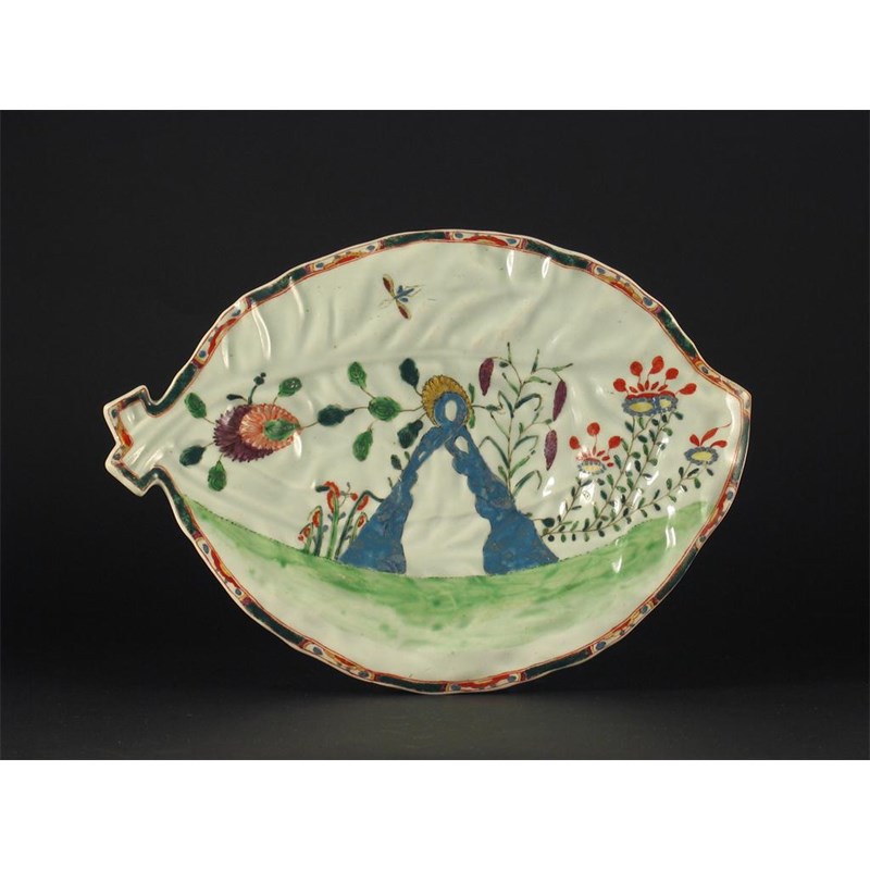 A Worcester leaf-shaped dish, painted in the famille verte palette with stylized flowers and strange blue rockwork. A small rim chip to the reverse. c.1755, 26.5cm. Ex. H.E Marshall Collection and Vincent Townrow Collection.