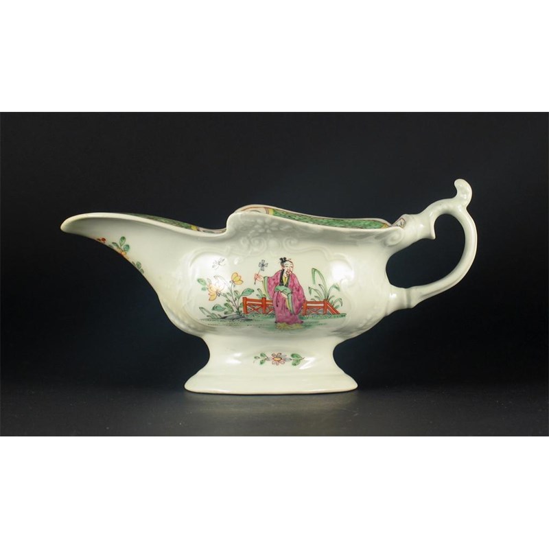 A large Worcester sauceboat, painted in the famille verte palette, one side with a Chinese figure, the other with a bird, unmarked. Some restoration. c.1755, 23cm.