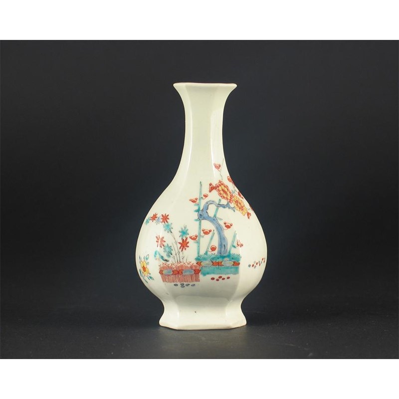An early Worcester hexagonal bottle, painted in the Kakiemon palette with the 'Banded Hedge' pattern, unmarked. Restoration to the neck. c.1753-5, 11.5cm. Cf. Spero & Sandon, The Zorensky Collection, no.48.