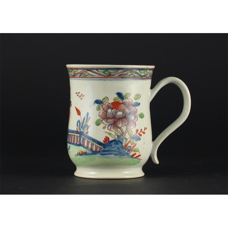 A scratch cross period Worcester mug, with a grooved loop handle and short flared foot, painted in underglaze blue and enamelled in red and green with flowers, a fence and rockwork, a blurred workman's mark and two incised lines to the base. The enamelling later, a well restored rim crack. c.1754, 9.4cm.