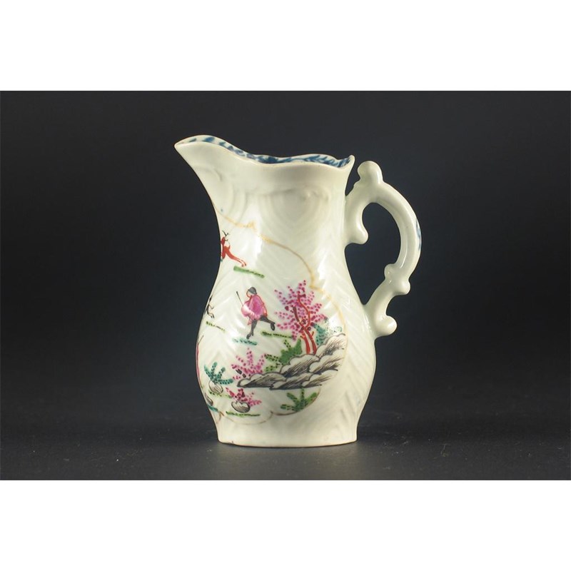 A Worcester feather moulded cream jug, painted with the 'Stag Hunt' pattern, a workman's mark. Some restoration to the rim. c.1755-60, 9cm.