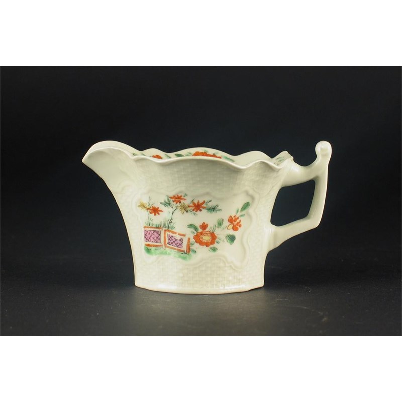 A Worcester basket moulded cream boat, each side painted with bamboo and peony issuing from a fence, unmarked. Some good restoration to the rim. c.1755, 10cm. Long.