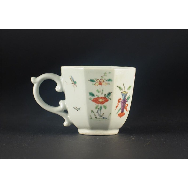 An early Worcester octagonal cup, painted with a Chinese figure and panels of flowers, vases and insects, unmarked, c.1753-5, 5.5cm. Ex. Albert Amor, Treasures from Toronto.