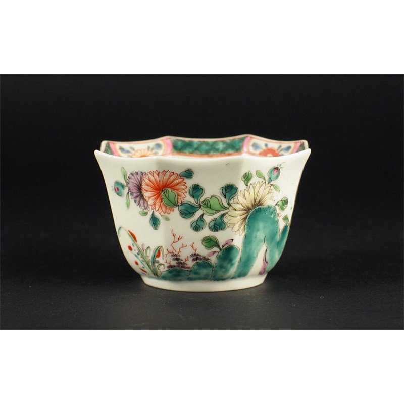 An early Worcester octagonal teabowl, painted in the famille verte palette with an insect, flowers and foliage above green rocks. A hair crack. c.1755, 6.5cm.