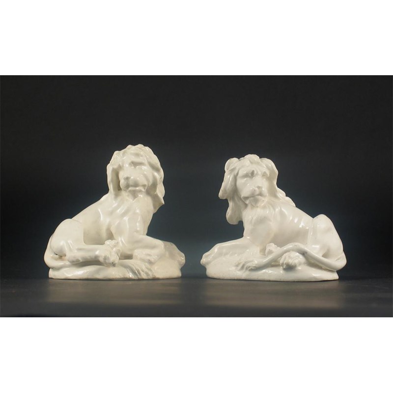 A rare pair of Derby dry edged white-glazed models of lions, lying on pad bases with their heads turned to the sides, no marks. Each with some firing faults, one with a chip to his mane. c.1750-54, 10.5cm. (2) Cf. P Bradshaw, Derby Porcelain Figures, p.34 for a similar pair in the Ashton Collection and Albert Amor Ltd. The John Hewett Collection. 1997. no.23.