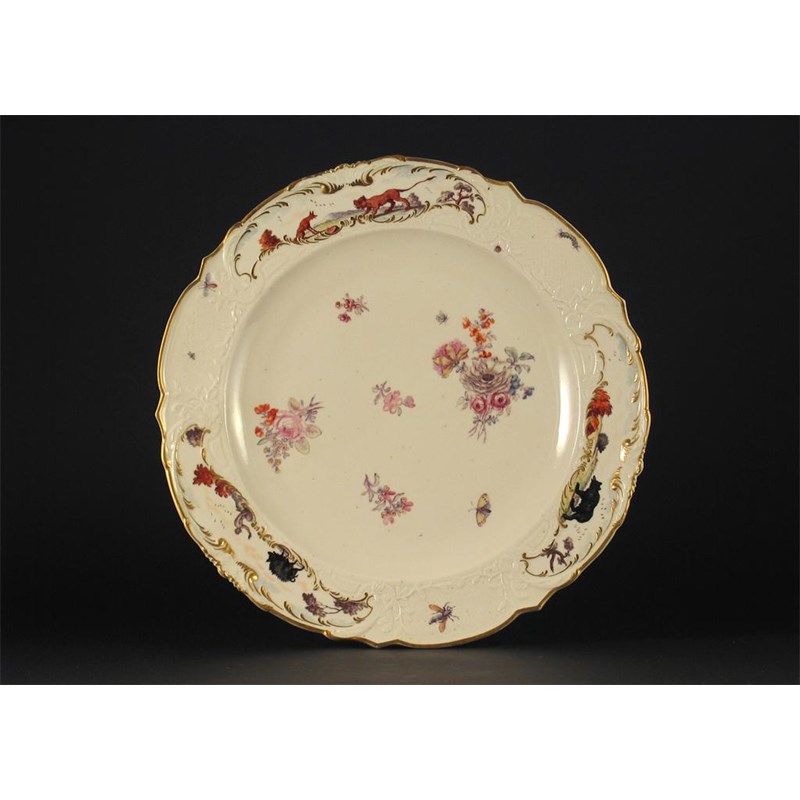 A Chelsea Warren Hastings pattern dish, the moulded border painted in the manner of Jeffryes Hamett O'Neale with three panels of animals, the centre with scattered flowers and insects, red anchor mark. Cracked in half and well restored. c.1755, 29cm. The Warren Hastings pattern is named after a large service once owned by the politician and was sold among his effects in 1818.
