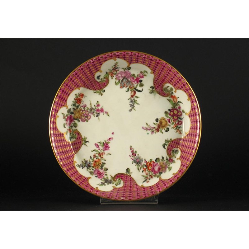 A Chelsea circular dish or stand, painted with five colourful flower sprays within a scrolling border of pink and gilt cell patterns, gold anchor mark, c.1760, 18.3cm.