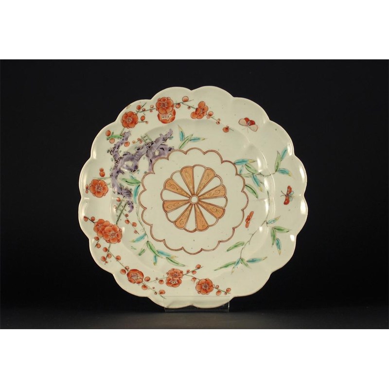A Chelsea lobed, moulded plate, painted with bamboo leaves and a flowering prunus branch encircling a chrysanthemum motif, red anchor mark. A 6mm rim chip. c.1755, 24.5cm.