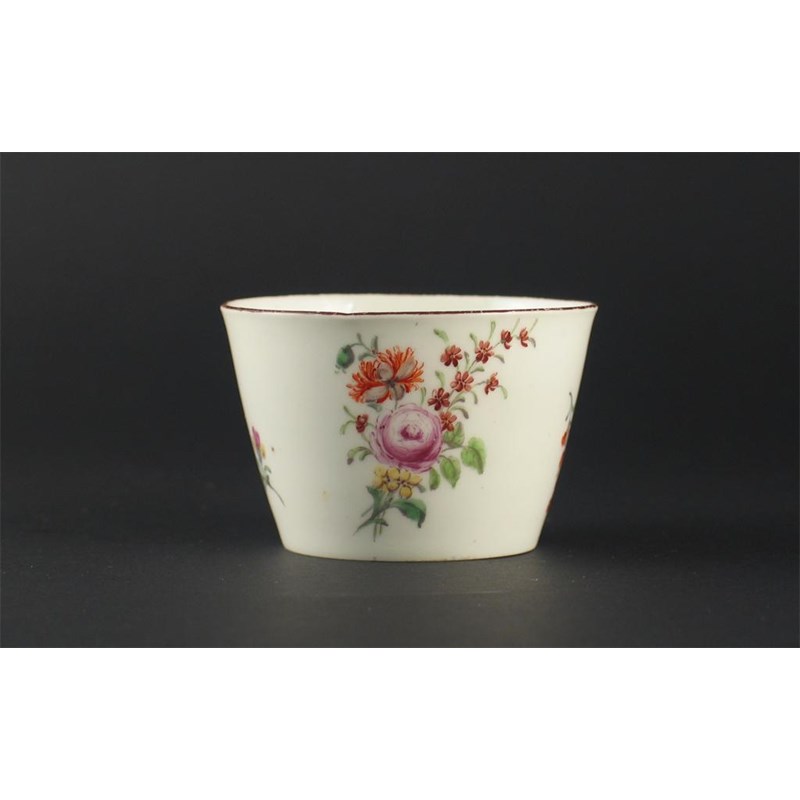 A Chelsea flared cylindrical beaker or teabowl, delicately painted with European flower sprigs and with a brown line rim, unmarked, c.1755, 7cm.