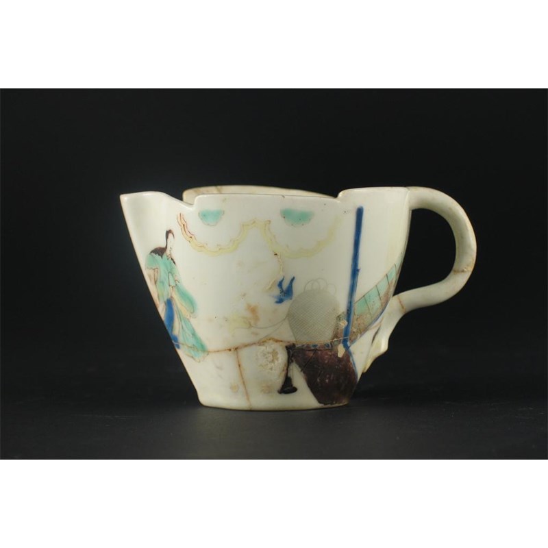 A rare Chelsea peach-shaped cream jug, painted with the 'Lady in a Pavilion' pattern, raised anchor mark. Previously riveted, misfired and extensively damaged. c.1750, 10.5cm.