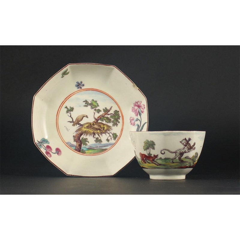 A rare Chelsea octagonal teabowl and saucer, decorated in the manner of Jeffryes Hamett O'Neale with scenes from Aesop's Fables after Francis Barlow, the teabowl illustrating 'The Tiger and The Fox', the saucer with 'The Young Kite and His Mother', both unmarked. The saucer with two 1.5cm. rim cracks and an 8mm rim chip. c.1752. (2)