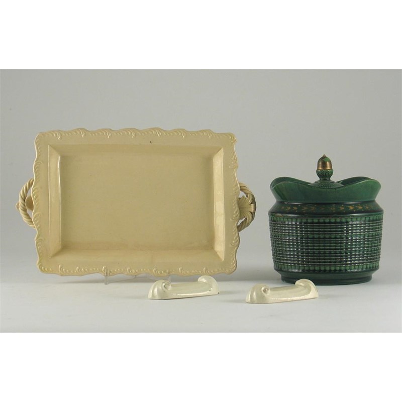 A green glazed engine-turned sugar bowl and cover, decorated with gilt details, a pair of creamware knife rests and a rectangular creamware warmer dish. Some damages. 18th/19th century, 26cm. Max. (5)