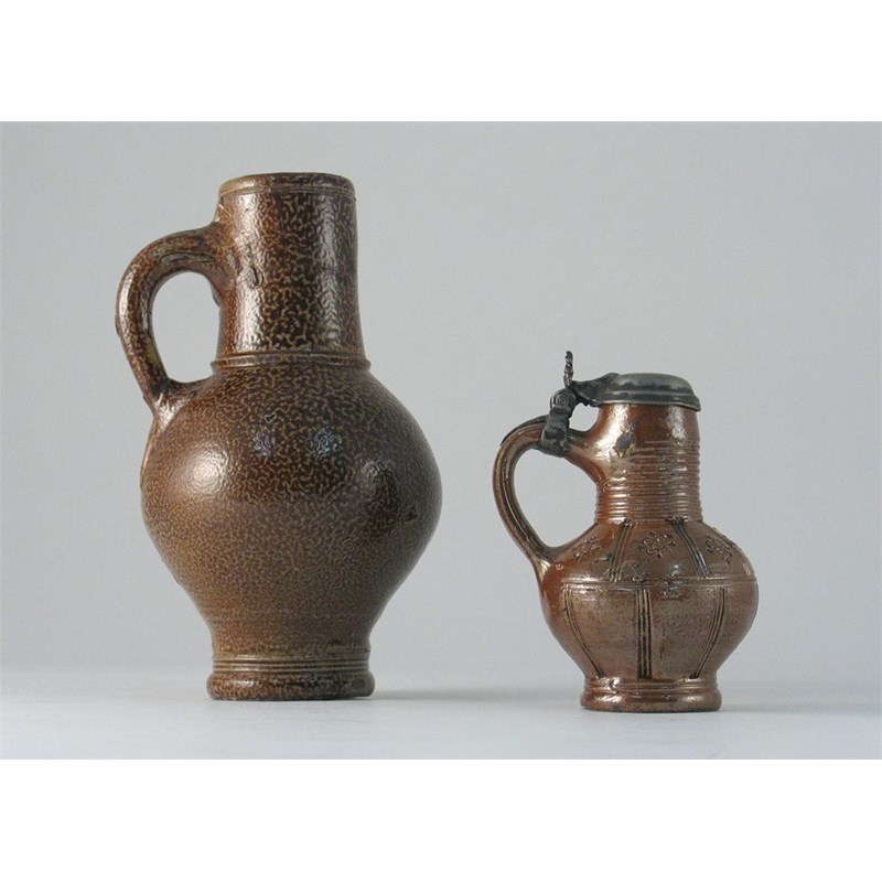 Two brown stoneware jugs, with loop handles, the smaller decorated with stylized impressed florettes. The larger damaged. 18th century, 20.5cm. (2)