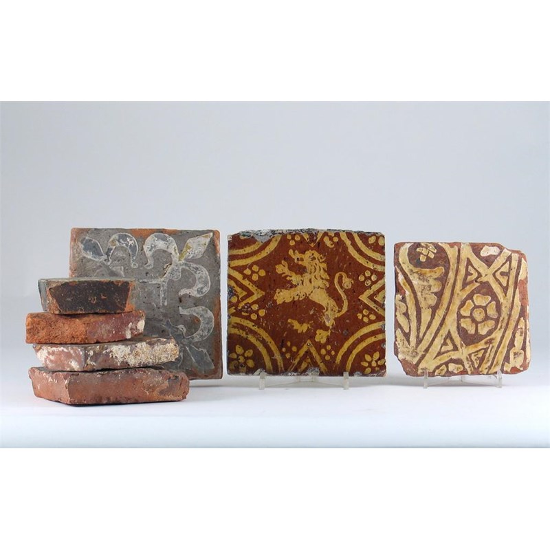 A collection of Medieval tiles, decorated with stylized motifs, one with a lion rampant, c.14th century, mostly Wessex, together with various fragments.