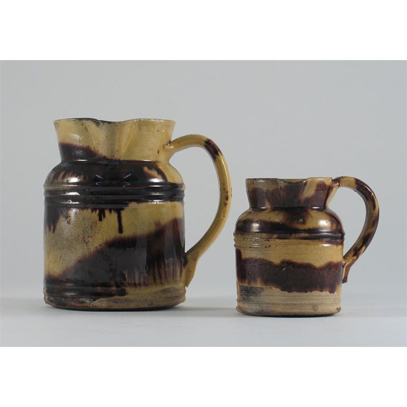 Two Mocha ware jugs, decorated with brown splashes on a honey ground. Minor damage. 19th century, 13.5cm. (2)