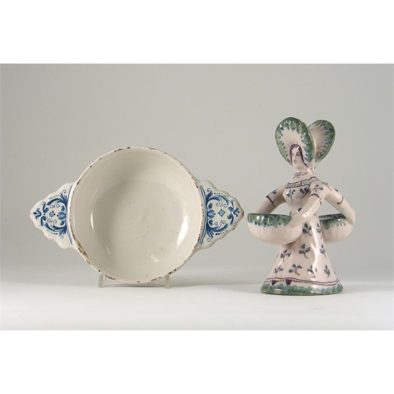 A faence double salt, modelled as two women standing back to back, together with a two-handled bowl, c.1900, 25cm. (2)