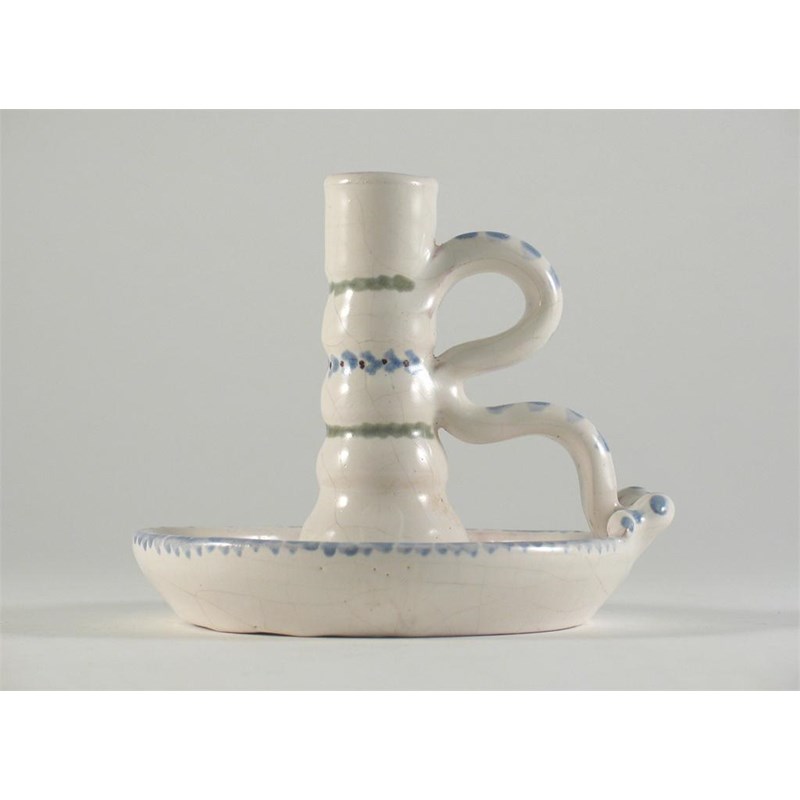A faence chamber stick, decorated with leaf sprigs and blue borders, 11.5cm.