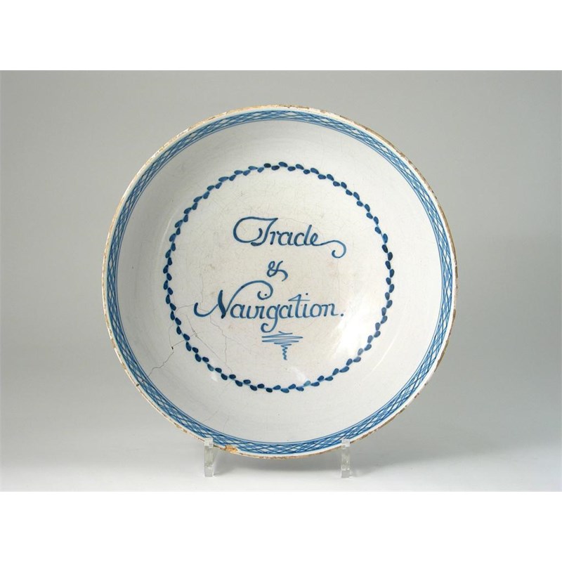 A Delft blue and white Trade and Navigation bowl, the exterior painted with flowers and foliage, the interior inscribed with a hatched border. Cracks and small chips. c.1760, 27cm.