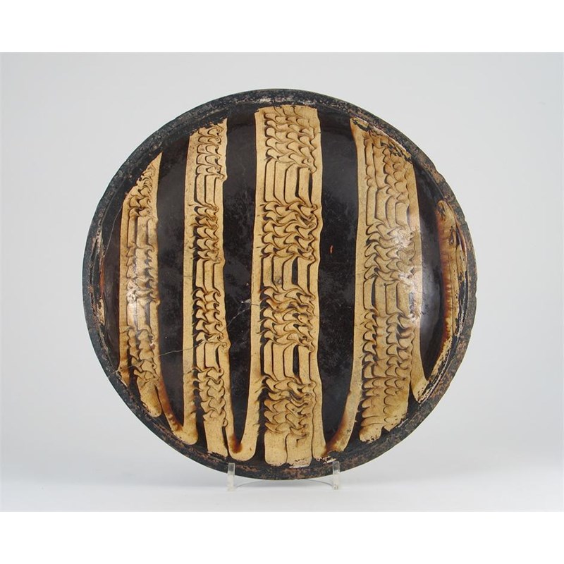 A slipware shallow bowl, decorated with dark brown bands, and combed slip trailed bars. A riveted crack. 18th century, 28cm.