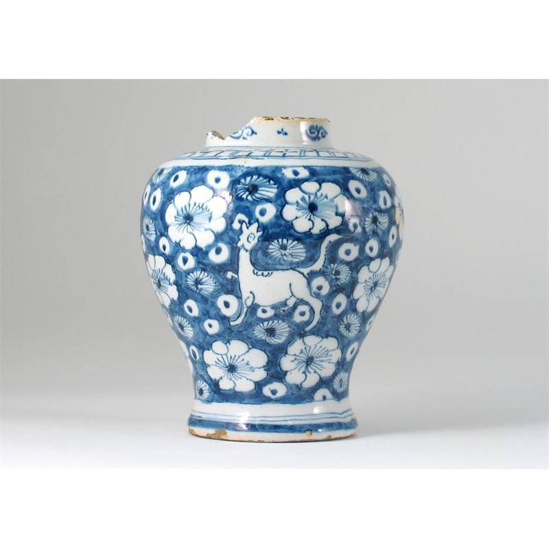 A Delft blue and white baluster vase, the body decorated with three walking goats amidst a multitude of flowers. Damage around the rim. 18th century, 15.5cm.