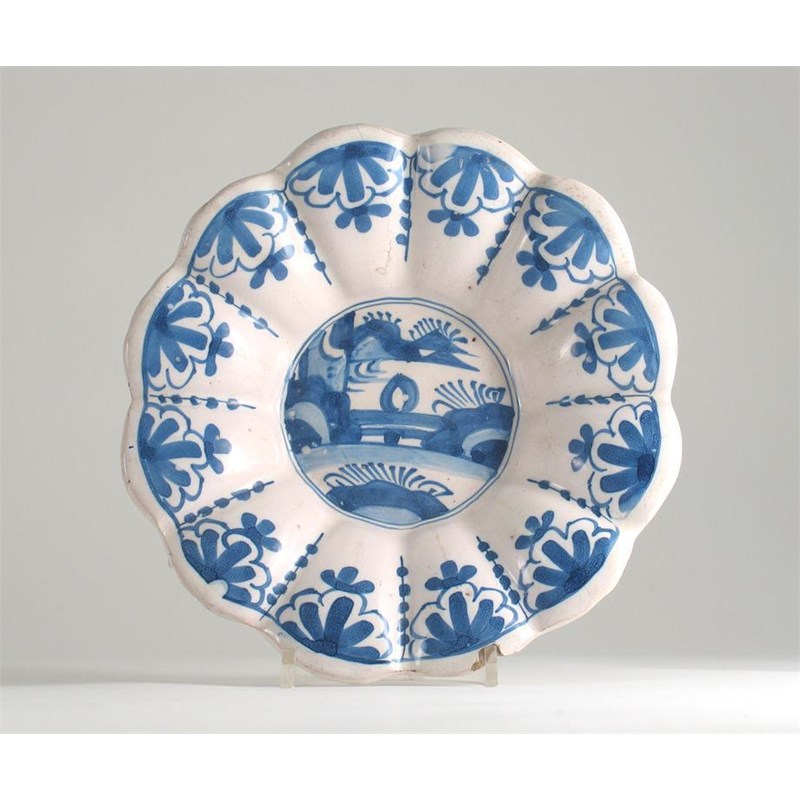 A Delft blue and white fluted plate, painted with a stylized watery landscape. Rim chips and cracks. 18th century, 21.5cm.