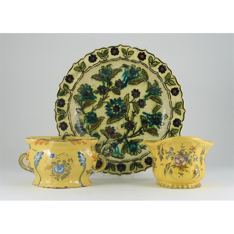 Two French faence yellow ground bough pots, painted with flowers, and a Lachenal Iznik style pottery dish, factory mark, 19th and 20th century, 33.5cm. Max. (3)