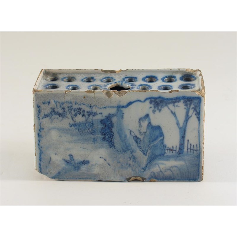 A Delft blue and white flower brick, painted with Chinese figures beside trees. Damaged and misfired. 18th century, 12.5cm.