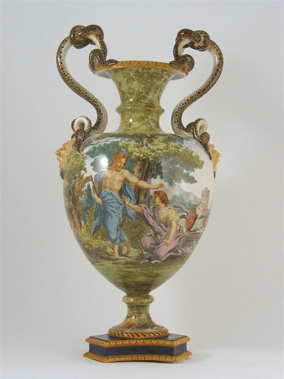 A large Ginori maiolica vase, painted with an Italianate religious scene in a wooded landscape, painted mark. Some good restoration to the base. Late 19th century, 62cm.