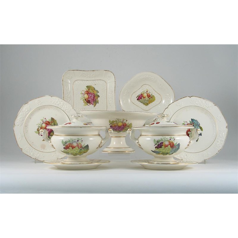 A creamware dessert service, probably Wilson, decorated with colourful vignettes of fruit, and with moulded borders, impressed crown marks, 1st half 19th century, comprising: two tureens, covers and stands, a tazza, two oval dishes, a square dish, four shell-shaped dishes, and twelve plates. Damage and wear. (26)