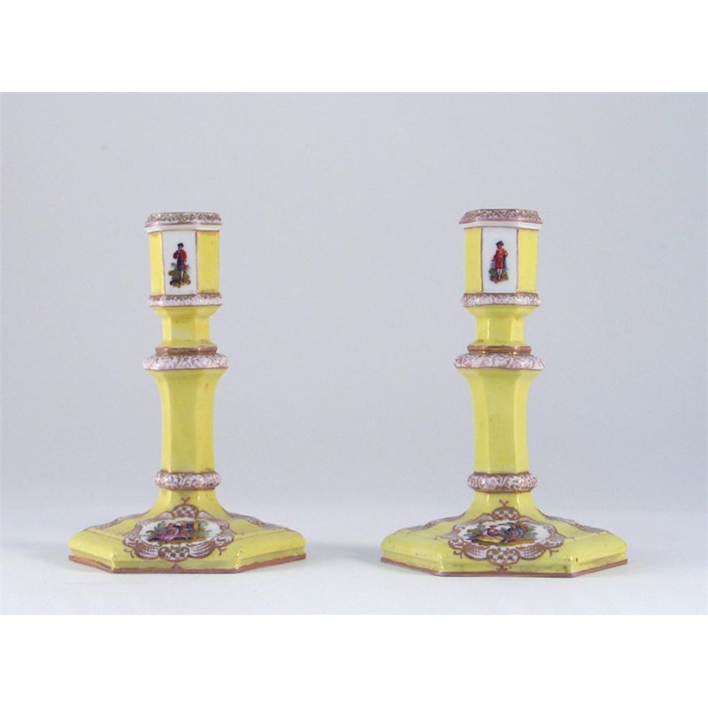 A pair of Berlin hexagonal-section candlesticks, painted with panels of figures on a canary yellow ground, sceptre marks. Some wear. Late 19th century, 13.5cm. (2)