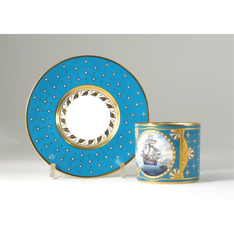 A coffee can and saucer, painted by Nowacki with a war ship on a blue, gilt and jewelled ground. (2)