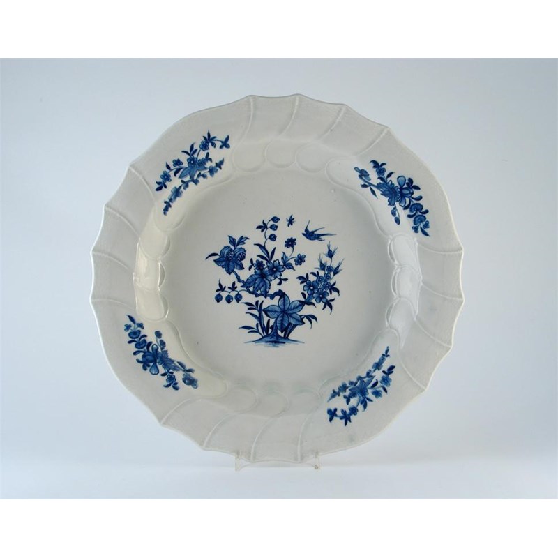 A large Tournay dish, painted in blue with flowering shrubs and spiral moulded borders, an incised mark, 18th/19th century, 36.5cm.