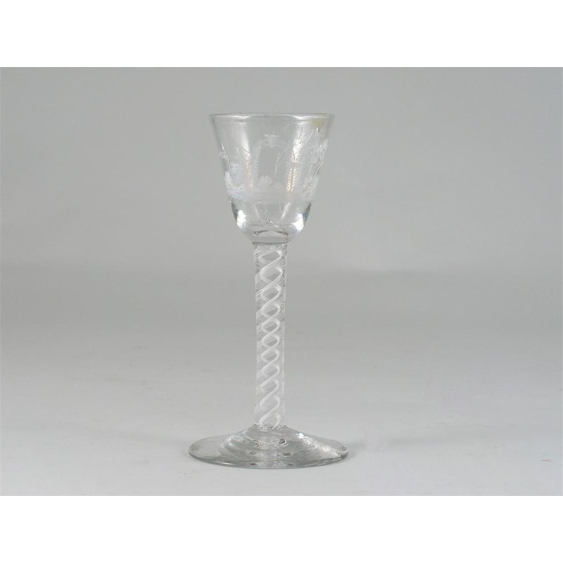 A Beilby wine glass, the bowl enamelled in white, with ruined arches, trees and shrubs, and raised on an opaque twist stem, c.1770. The bowl cracked and repaired. 15cm.