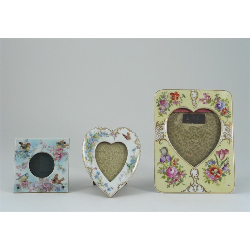 Three porcelain frames, one decorated with song birds, the others with hearts, 21cm. Max. (3)