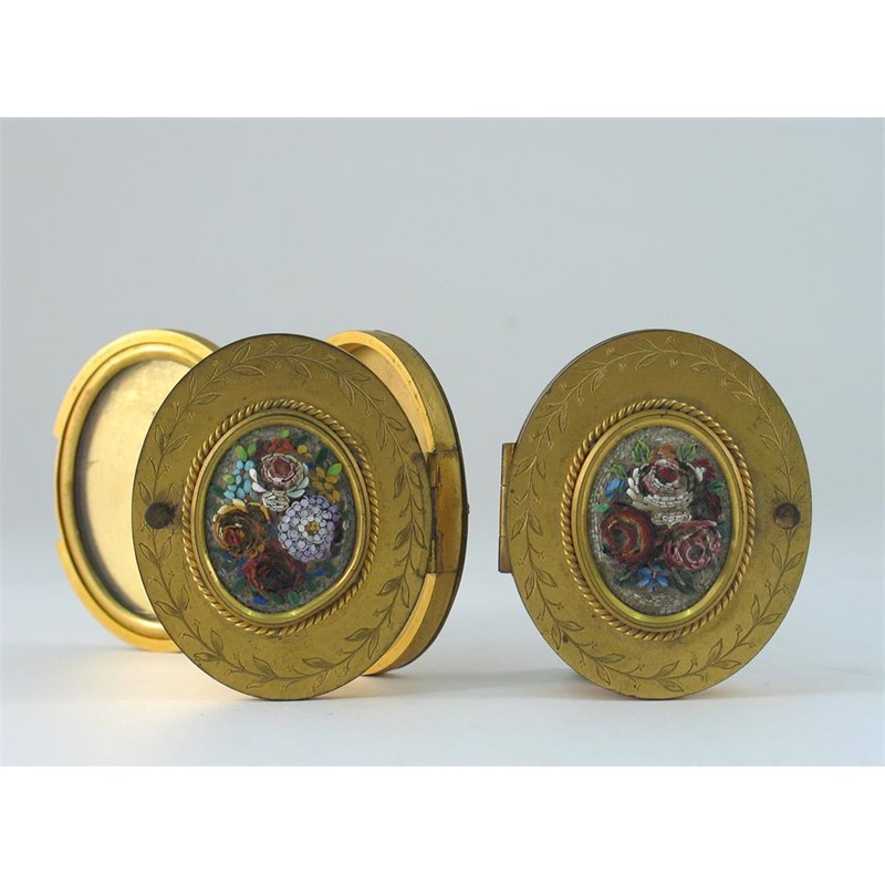 A pair of gilt metal oval photo frames, with hinged lids and set with micro-mosaic panels. Some tesseri missing. 7.5cm. (2)