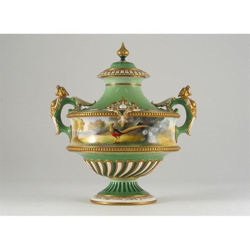 A Hadley's Worcester green ground vase and cover, decorated with a golden pheasant to each side, printed mark, c.1900, 24cm. (2)