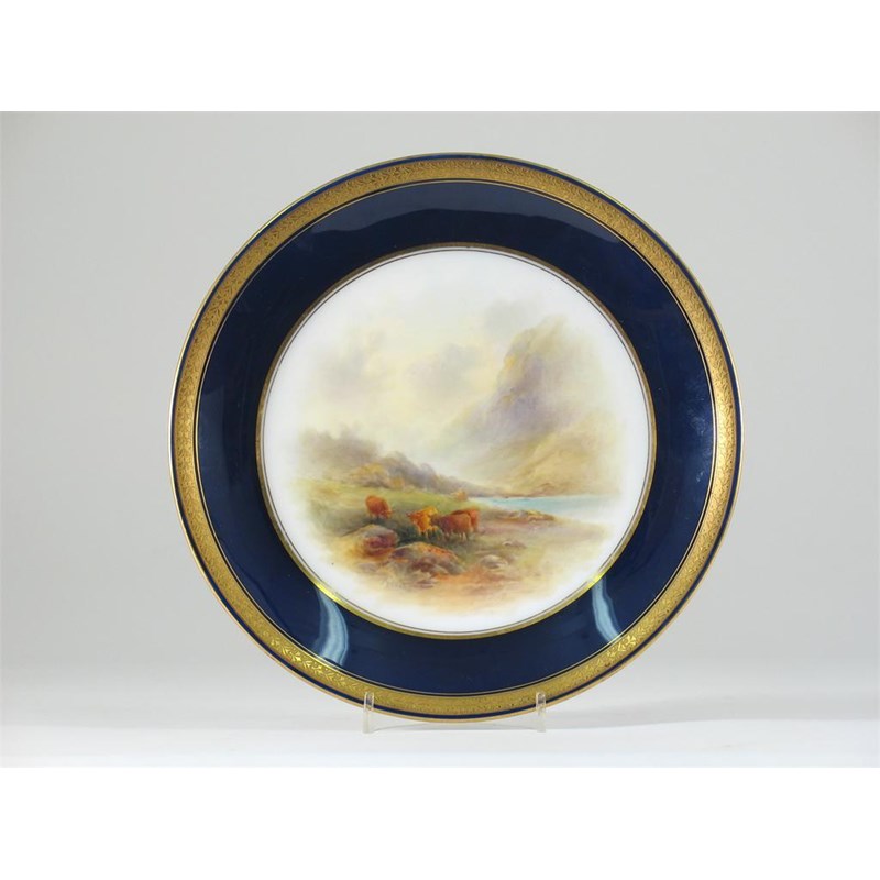 A Royal Worcester plate, painted with four Highland cattle, signed: 'J. Stinton', date code for 1918, 23cm.