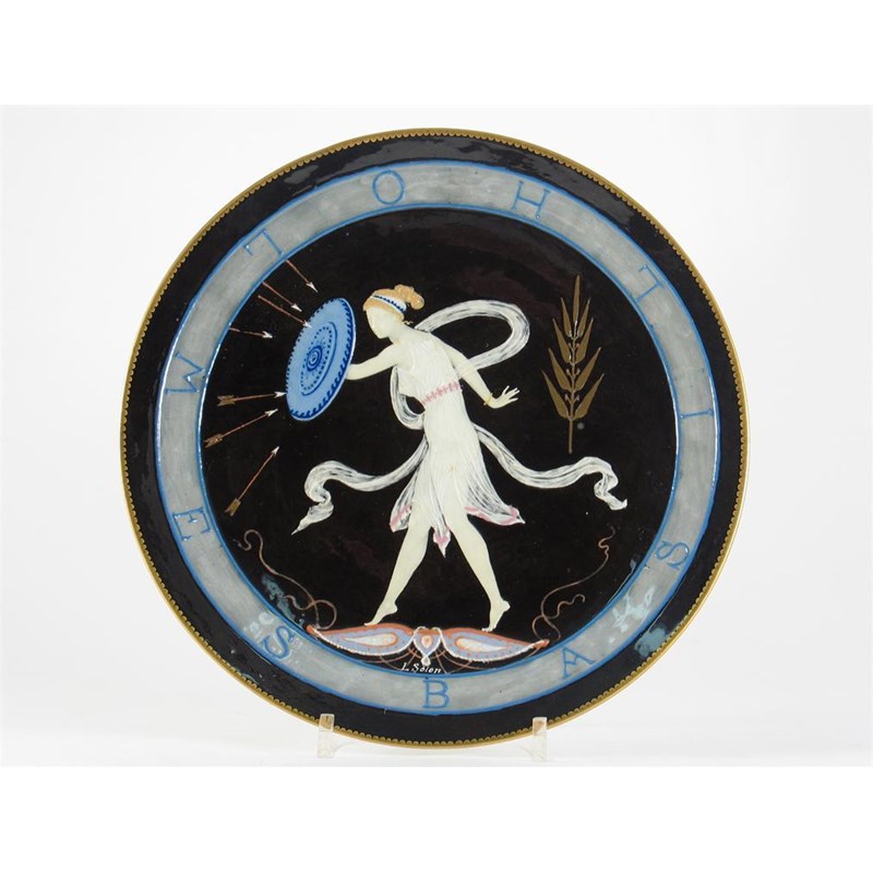 A rare dated Minton pte-sur-pte plate by Marc Louis Solon, decorated in polychrome with a young female warrior in flowing diaphanous robes, defending herself with a shield from seven arrows, she stands upon a bow which incorporates the date 1874 above the signature 'L Solon', all upon a chocolate ground within a band inscribed 'Basil Holmes', a gilt dentil rim, impressed marks, 23.5cm. It is interesting to note that Solon exhibited his multi-coloured pte-sur-pte at all the major international exhibitions and first showed his Pompeiian or Etruscan styles in Vienna in 1873.